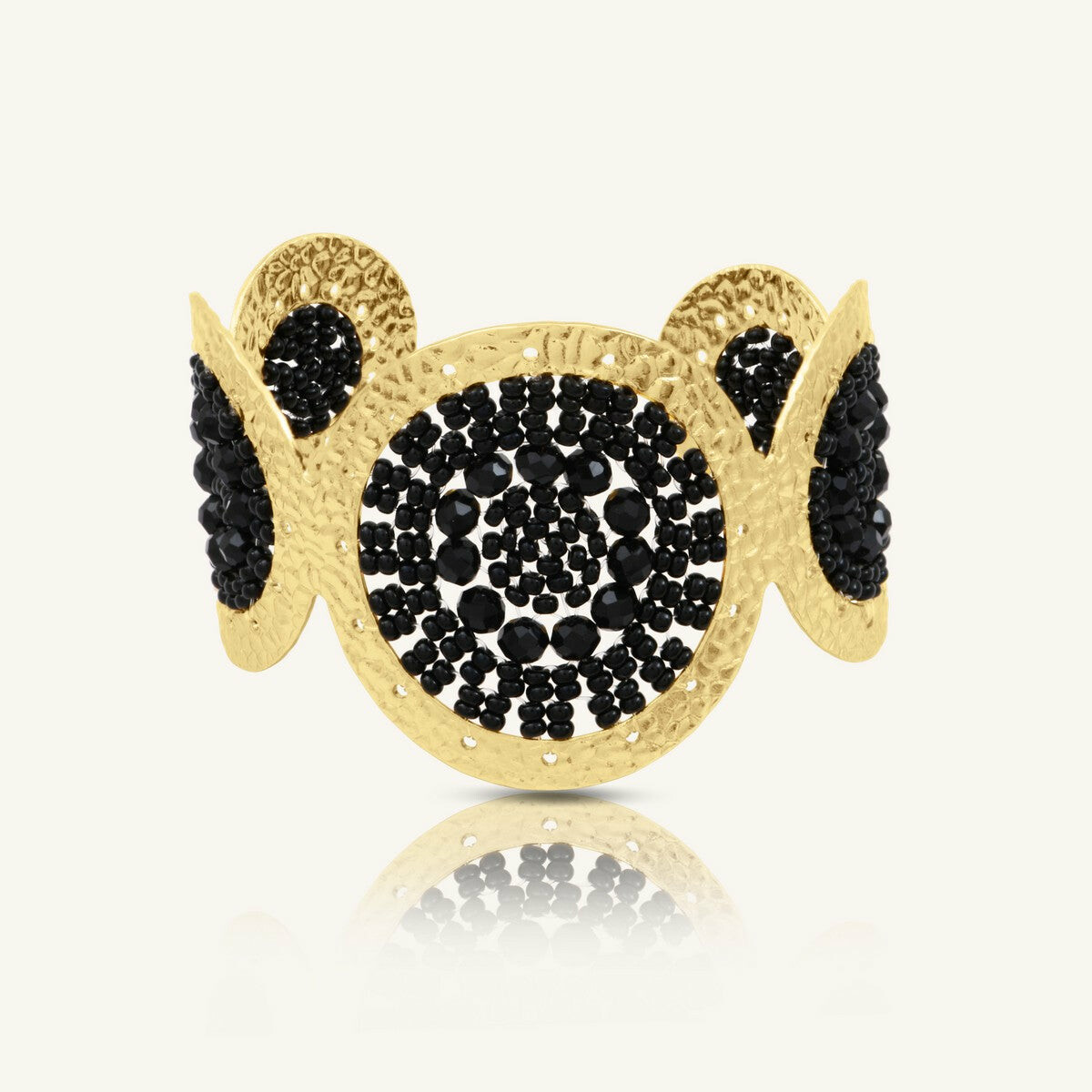 Manchette Sàntibé Bijoux Ushuaia en laiton, métal doré et perles noir